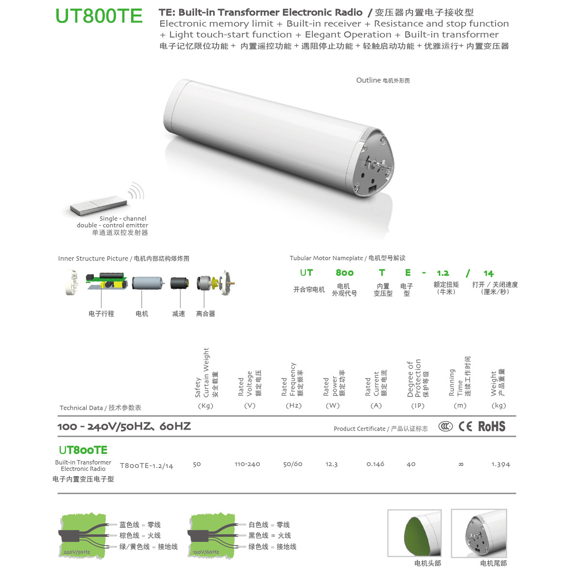 内置变压器(100V-240V)+优雅运行功能+电子记忆限位功能+内置遥控功能+遇阻停止功能+轻触启动功能+停电手拉功能+第三行程点功能+可外接干触点开关功能